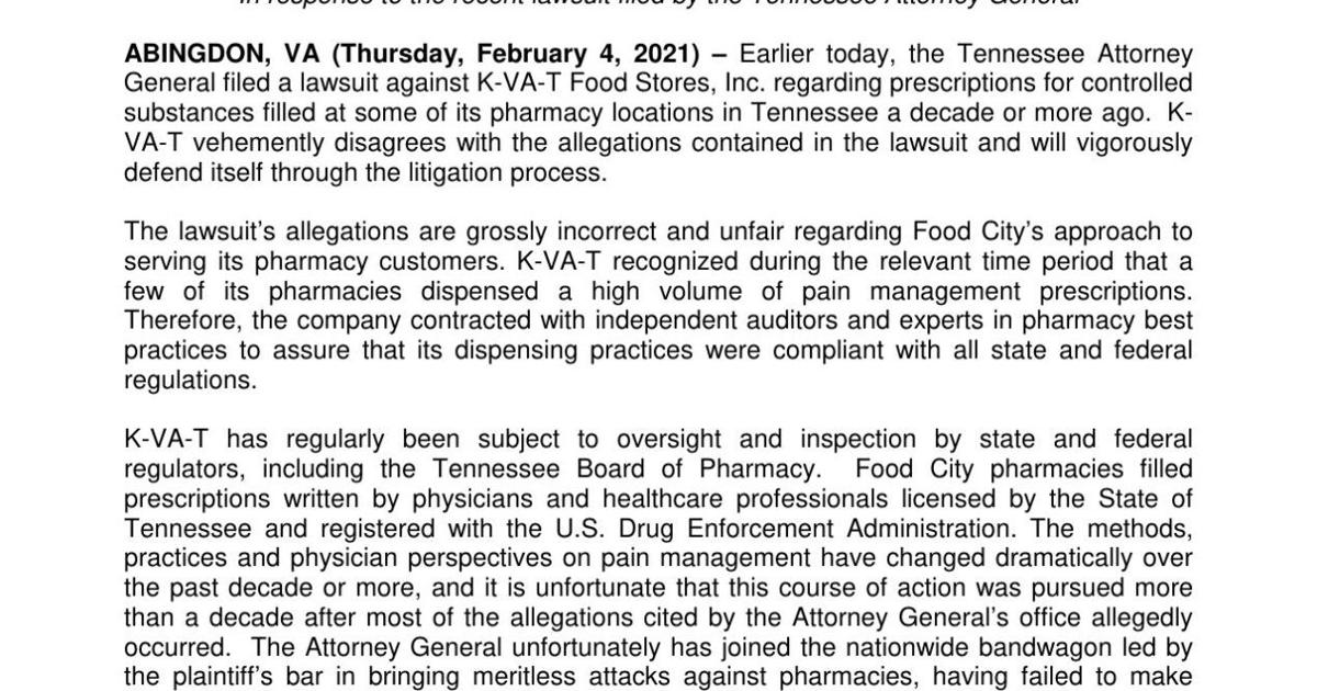 Tennessee Ag Food City Unlawfully Sold Millions Of Prescription Opioids